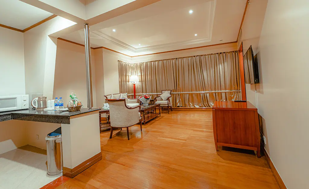 A 356 sq. ft. suit with an additional meeting space keeps your staycation uninterrupted. All our suits room offers complimentary toiletries, additional space, work desk and air-conditioning. It is ornamented with the magnificent set up with living/dining and kitchenette fittings and amenities including A mini bar, Safely Locker, free Wi-Fi and two LED Tv.